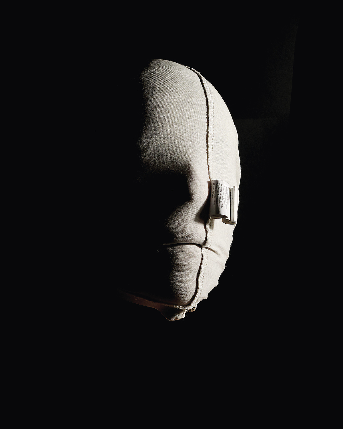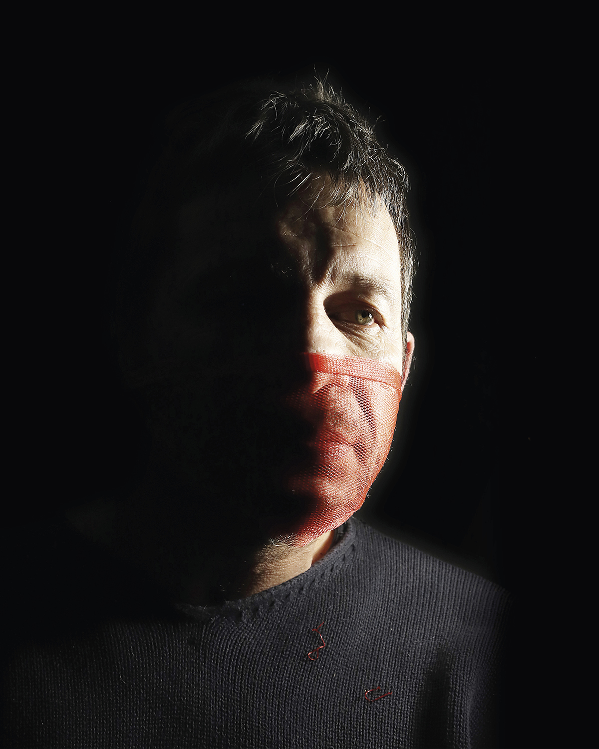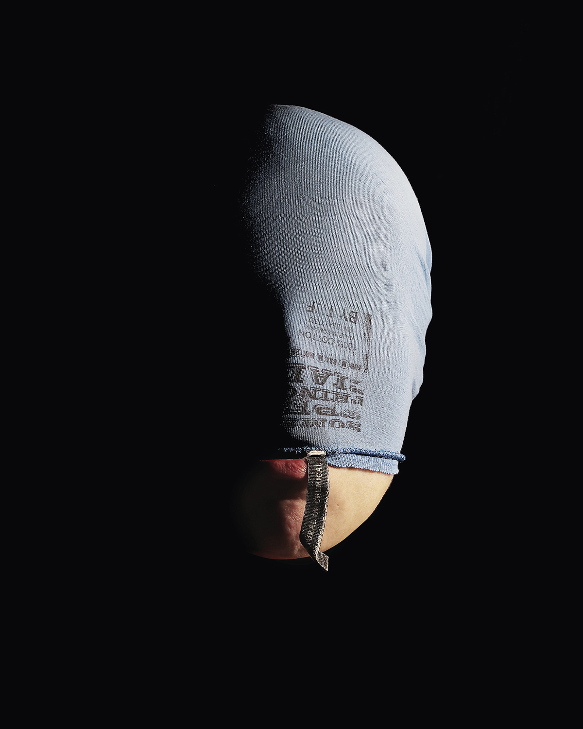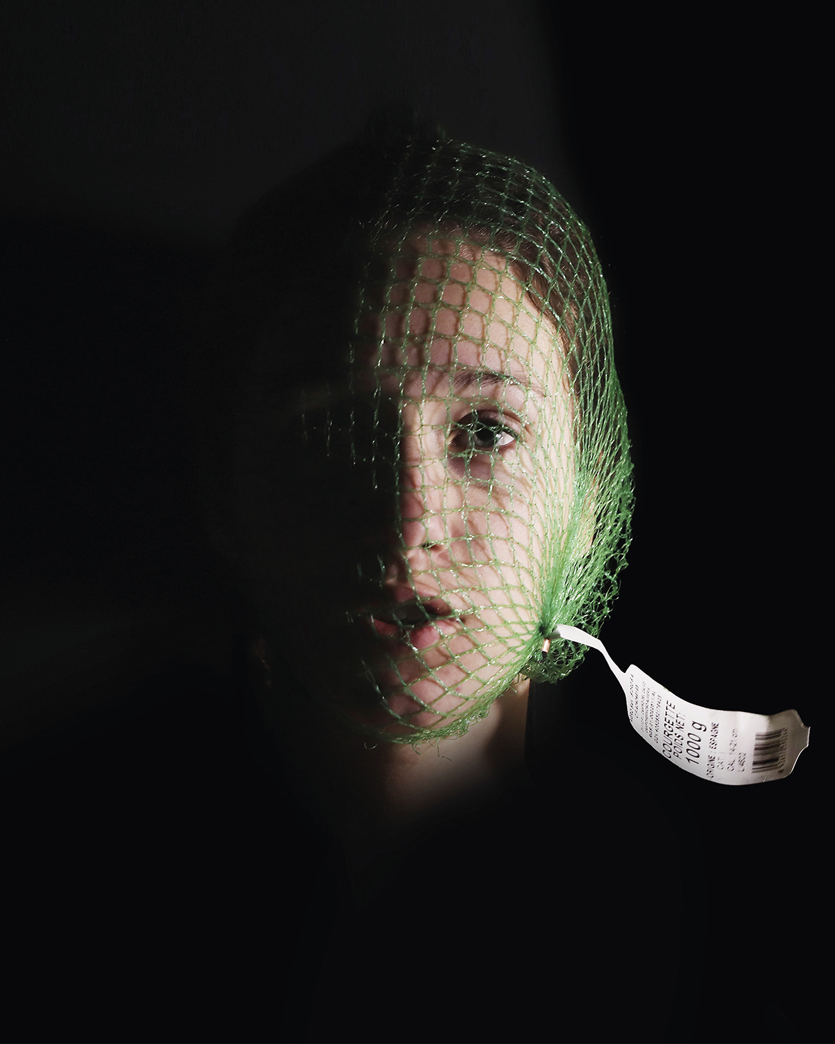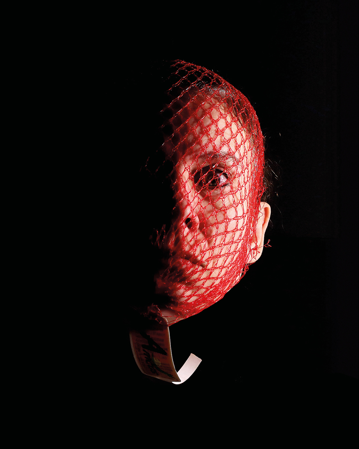 L’emballage de nos fruits et légumes, ou le moindre de nos vêtements, objets insignifiants de notre quotidien, deviennent l’habillage dramatique de nos multiples visages : à la fois victime muselée et asphyxiée, coupable cagoulé et aveuglé, ou encore guerrier masqué.