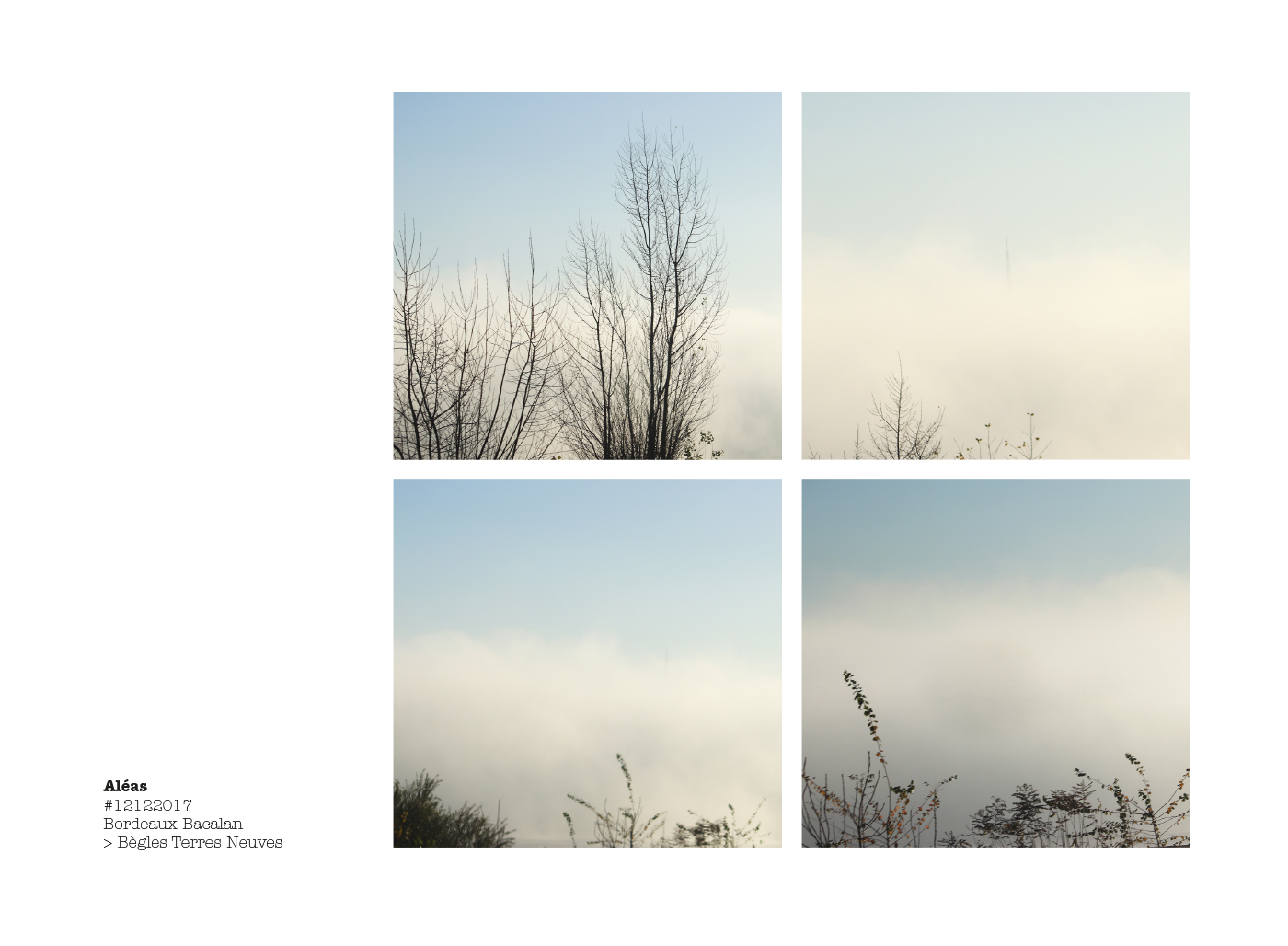 De novembre 2017 à mars 2018, parmi les 30 à 60 photos saisies quotidiennement, essentiellement en voiture mais quelquefois à vélo ou dans le tram, au départ de Bordeaux Bacalan ou Lacanau jusqu’à Bègles Terres Neuves, je sélectionne 4 images qui composeront ensemble le paysage du trajet.